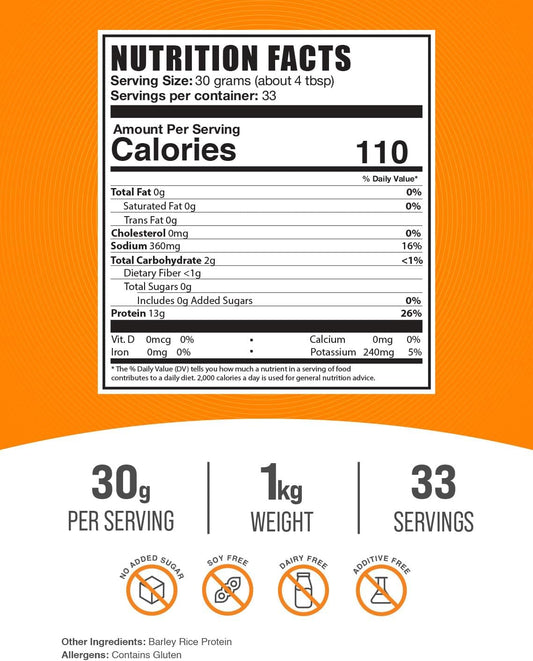 BulkSupplements.com Barley Rice Protein Powder 1kg (2.2 lbs) - Vegan Unflavored Dairy Free Protein Source, 30g per Serving