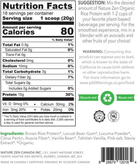 Organic Vegan Protein Powder with Rice Protein, Sugar Free, Dairy Free, Soy Free, Gluten Free, Non GMO, Kosher, High Fiber - Tahitian Vanilla - 0.8LB
