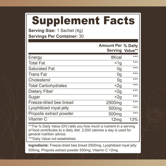 VIVE NUTRITION Queen's Boost Powder - Sugar-Free Bee Bread, Royal Jelly & Propolis with Vitamin C - Non-GMO Immune Support & Energy - 30 Sachets