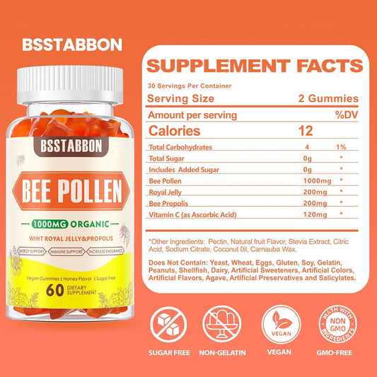 Immune Support Gummies with Bee Pollen, Royal Jelly, Bee Propolis, Vitamin C - Antioxidant Boost - 60 Count