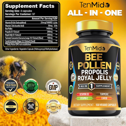 Organic Bee Pollen Supplement with Propolis, Royal Jelly, Turmeric, Carob - Energy, Immune, Digestive Support - 150 Capsules