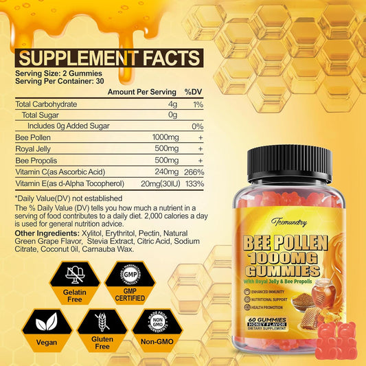 Sugar-Free Bee Pollen Gummies with Royal Jelly & Propolis, 1000MG, Rich in Vitamin C & E, Vegetarian, Non-GMO, Gluten-Free, Immunity & Skin Health Support