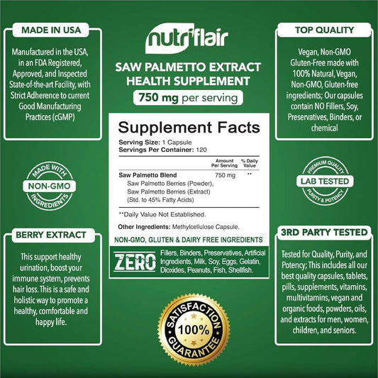 Saw Palmetto Extract 750mg Capsules - Prostate & Hair Loss Support, Natural DHT Blocker for Men and Women, 120 Count