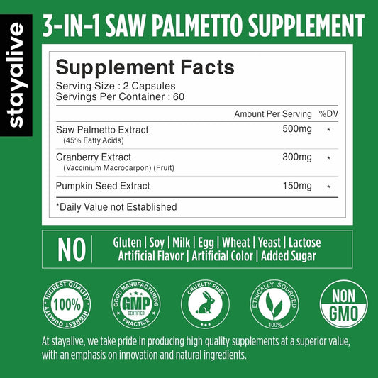 Saw Palmetto Extract Capsules 950mg with Cranberry & Pumpkin Seed - 120 Vegan Pills for Hair, U.T & Prostate - Non-GMO & Gluten Free Supplement for Men and Women