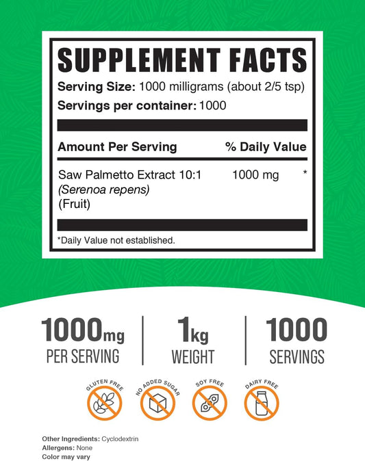 BulkSupplements.com Serenoa Repens Saw Palmetto Extract Powder - Vegan & Gluten Free Supplement, 1000mg per Serving, 1kg (2.2 lbs) Pack