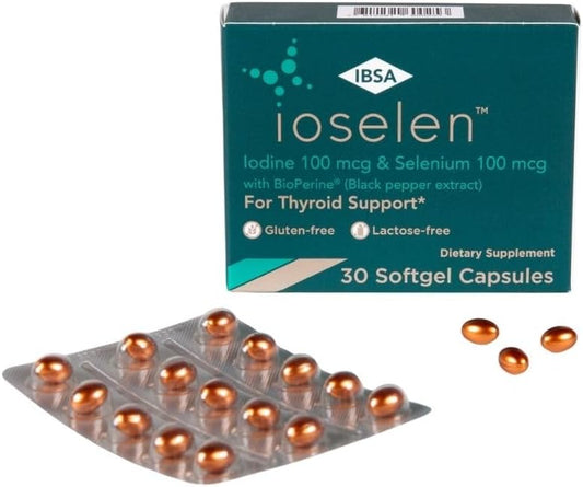 Thyroid Support Supplement with 100 mcg Selenium, 100 mcg Iodine, and 5mg BioPerine - 30 Soft-Gel Caps for Enhanced Absorption - Gluten-Free, Lactose-Free, Non-GMO - Ibsa Ioselen