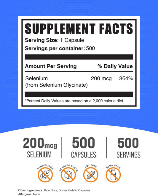 BulkSupplements.com Selenium Glycinate Capsules - 200mcg Trace Mineral Supplement - Gluten Free, 500 Count.
