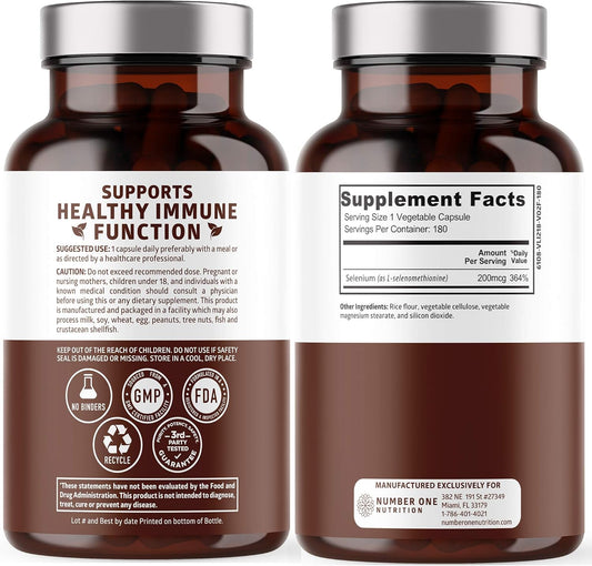 N1N Premium Pure Selenium 200MCG Capsules for Immunity, Heart, Thyroid, and Prostate Health - 180 Count