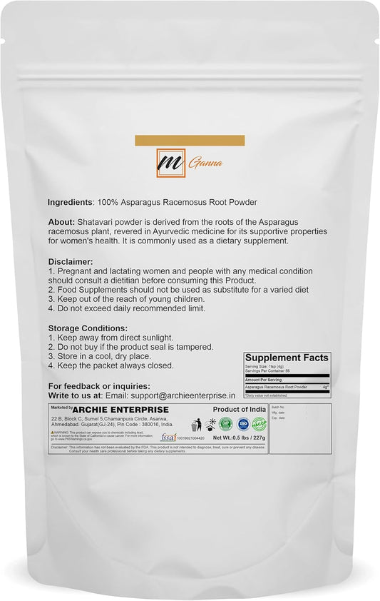 Organic mGanna Shatavari Powder for Healthy Skin, Hair, and Wellness - 0.5 lbs / 227 g