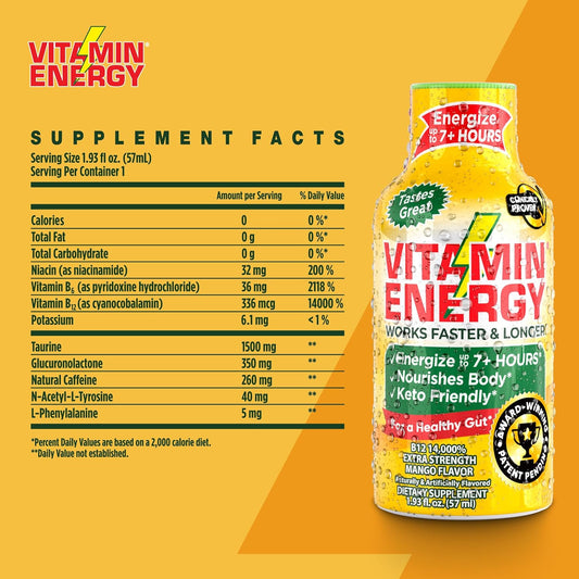 Mango Vitamin B12 Energy Shots - Natural Focus Drink, Sugar-Free, Energize 7+ Hours - Pack of 12