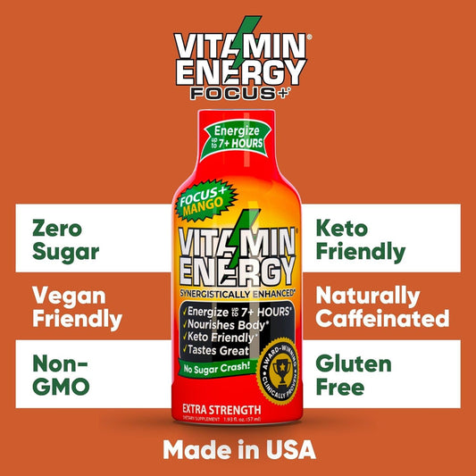Sugar-Free Vitamin Energy Shots for Focus & Energy Boost | Natural Supplement with B6, B12, L-Theanine, CoQ10 | Lasts up to 7 Hours | Mango Flavor | 48 Count