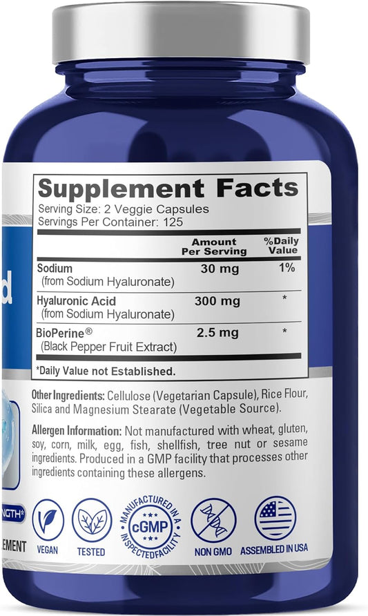300mg Hyaluronic Acid in 250 Vegan Capsules - Non-GMO Formula by NusaPure