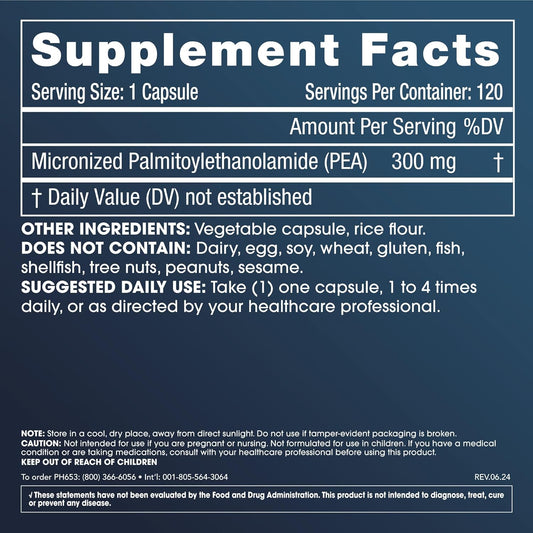 300mg Pure Micronized PEA Capsules for Pain Relief, Sleep Support, and Longevity - 120 Capsules