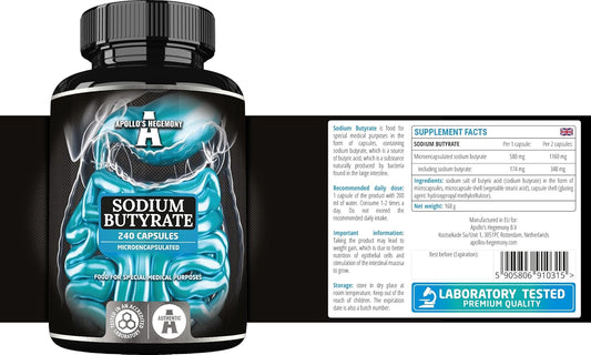 High Dose Sodium Butyrate Capsules 570mg (30% Butyric Acid) - 120 Vegan Capsules - 4 Month Supply - Gut Health Support - Apollo's Hegemony