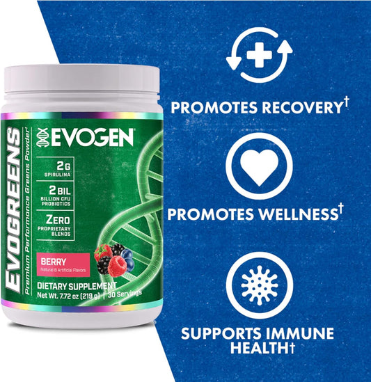 Evogen Evogreens Super Greens Powder - Boost Recovery, Wellness, & Immune Health - Spirulina, Probiotics, Pomegranate - Berry - 30 Servings