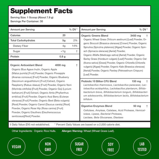 Organic Super Greens Powder with 20+ Green Veggies, Antioxidants, Digestive Enzymes & Probiotics - 9.0 Oz Unflavored