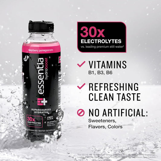 Essentia Hydroboost Raspberry Pomegranate Bottled Water 15.2 fl oz 12 Pack - Enhanced with B-Complex Vitamins & Electrolytes for Supercharged Hydration