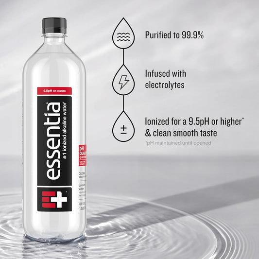 Essentia Water 1L Bottle - 99.9% Pure Ionized Alkaline Water with Electrolytes, pH 9.5+, Smooth Taste