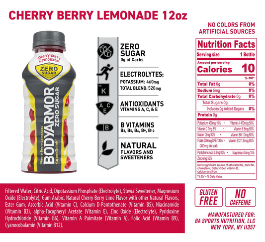 BODYARMOR ZERO Sugar Cherry Berry Lemonade - Sugar Free Sports Drink with Natural Flavors and Electrolytes - 12 fl oz (Pack of 8)