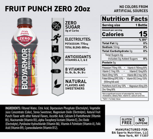 BODYARMOR ZERO Sugar Fruit Punch Sports Drink - Sugar-Free Hydration with Electrolytes and Antioxidants - 20 fl oz (Pack of 6)