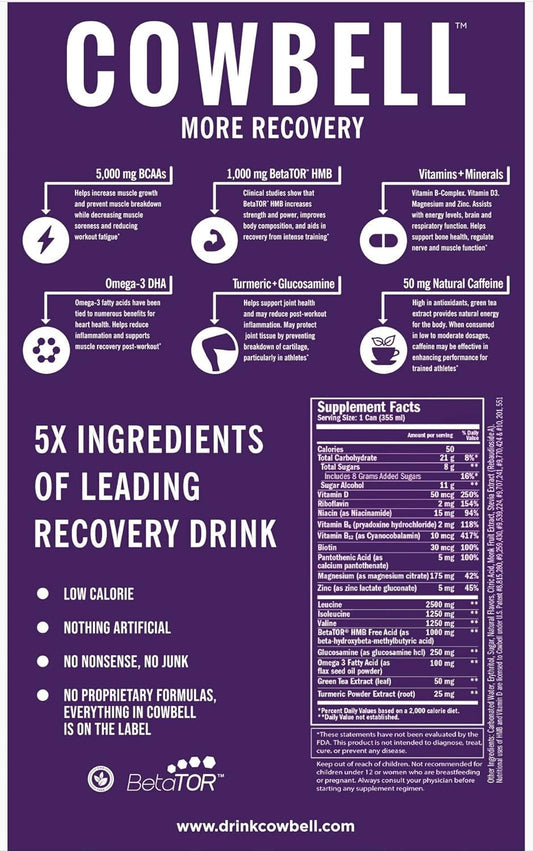 Cowbell Performance & Recovery - Muscle Building & Repair Drink with 5,000 mg BCAAs, 1,000 mg BetaTOR HMB, Glucosamine, Omega-3, Green Tea - No Artificial Ingredients - 12-oz Cans (Pack of 12)