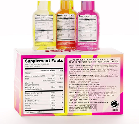 AdvoCare Slam Liquid Vitamin & Amino Acid Supplement Variety Pack - 12 Bottles - Orange, Berry, Lemonade - Vitamin B-12, B-6, Folic Acid & More