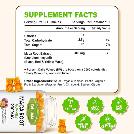 Premium Zetelixia Maca Root Gummies for Enhanced Absorption - Yellow, Red, Black Maca Blend for Women and Men - Vegan Passion Fruit Flavor - 120 Gummies