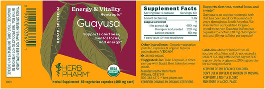 Organic Herb Pharm Guayusa Extract Capsules: Vegan Nootropic Brain Supplement for Energy & Focus, Antioxidant Support, Fast-Absorbing, 60 Ct - 30 Day Supply