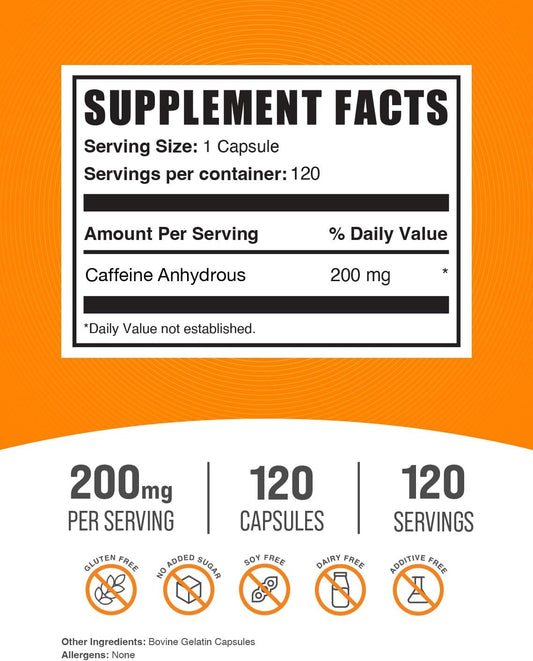 BulkSupplements.com 200mg Caffeine Capsules - Energy Support Supplements for Alertness - 120 Capsules, 1 Capsule per Serving