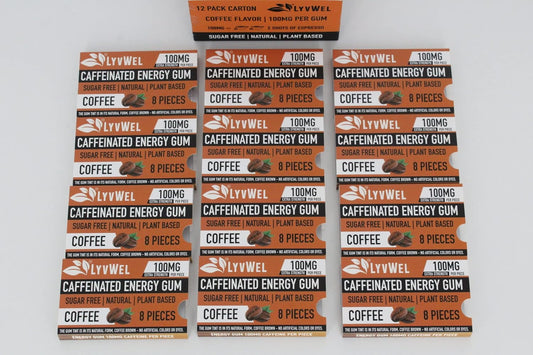 LyvWel Energy Gum | Natural Sugar-Free Pre-Workout Boost with 100mg Caffeine | Stay Awake with Essential Energy Supplement - Carton of 12 (Coffee Flavor)