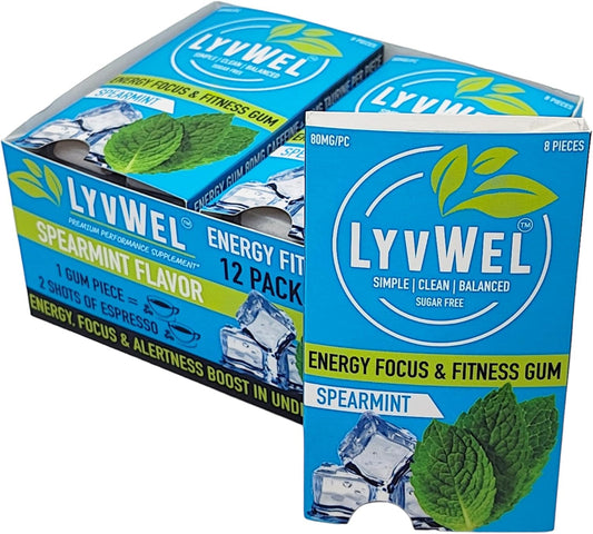 Spearmint Lyvwel Energy Gum: Sugar-Free Pre-Workout Boost with 80mg Caffeine and 50mg Taurine - All Natural Energy Supplement for Staying Awake (12 Pack)Vendor:LyvwelRegular price $164.26 AUDRegular priceUnit price / per-