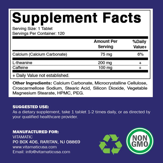Focused Energy Nootropic Supplement - 2 Packs of 120 Vegetarian Caffeine Pills with L-Theanine - 300 mg per Tablet - Total 240 TabletsVendor:VitamaticRegular price $108.06 AUDRegular priceUnit price / per-