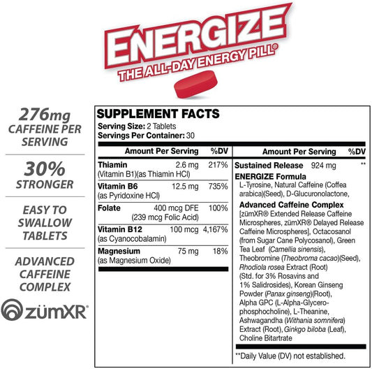 iSatori Energize Extra Strength Caffeine Pills - Long-Lasting Energy with Extended Release - Improved Clarity & Support for Men & Women - No Jitters, No Crash - 60 Tablets