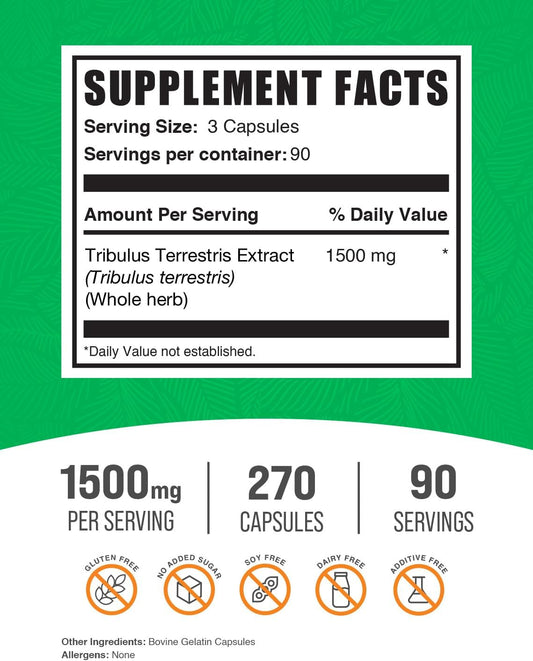 BulkSupplements.com Tribulus Terrestris Capsules - 1500mg, Gluten Free - 270 Capsules for Men & Women