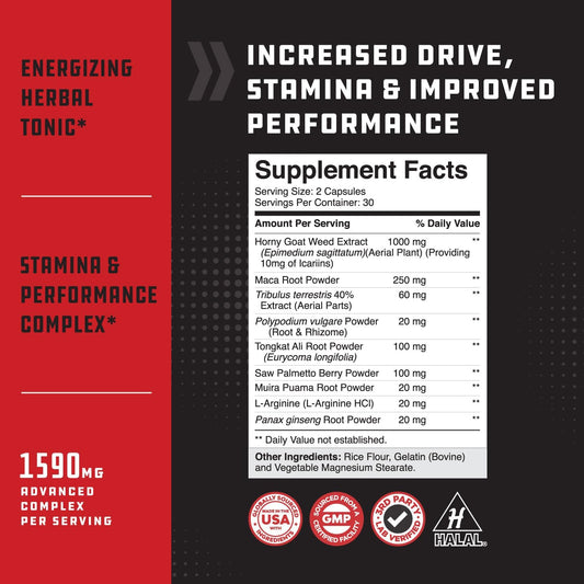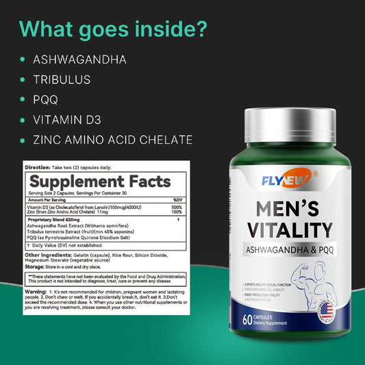 Men's Vitality & Energy Booster with Ashwagandha, PQQ, Tribulus Terrestris Extract, Vitamin D3 - 60 Capsules, USA Made