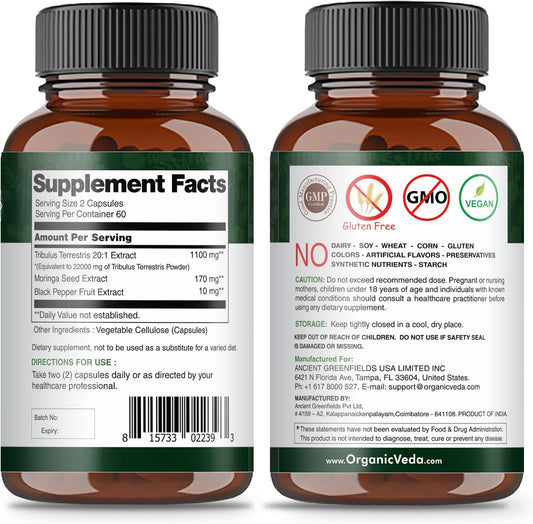 Organic Veda Tribulus Terrestris Capsules for Men - 22000mg Super Strength with Moringa & Black Pepper - Energy, Stamina, Performance - Vegan, Non-GMO - 120 Count