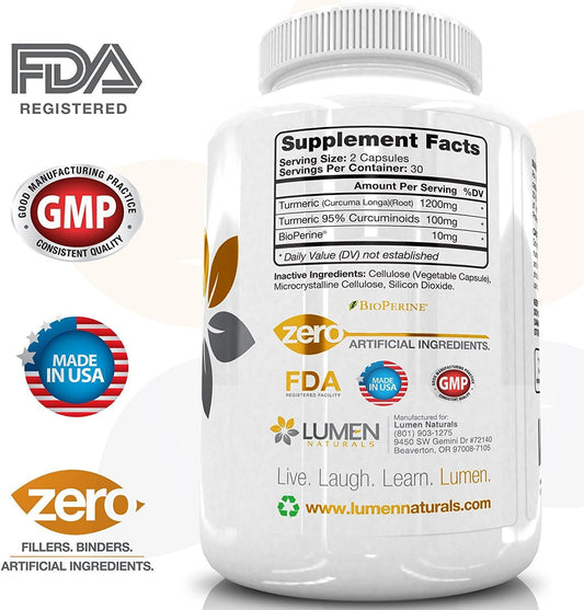 Organic Extra Strength Turmeric Curcumin Capsules with BioPerine Black Pepper - 1200mg - 95% Curcuminoids - 60 Count - Joint and Back Pain Relief