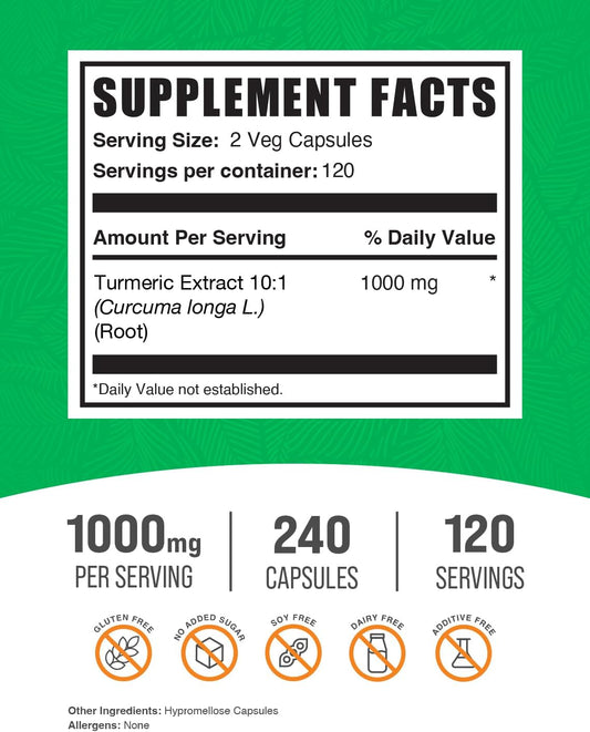 BulkSupplements.com Turmeric Curcumin Extract Capsules 1000mg - Gluten Free, 240 Veg Capsules - Pack of 1