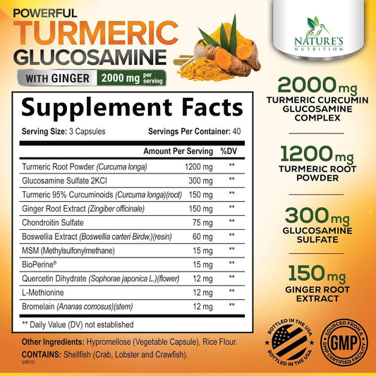Turmeric Curcumin Supplement with Glucosamine, Chondroitin, Ginger - 95% Curcuminoids, 2000mg, BioPerine Black Pepper - Joint Support - 120 Capsules - Non-GMO - USA Bottled