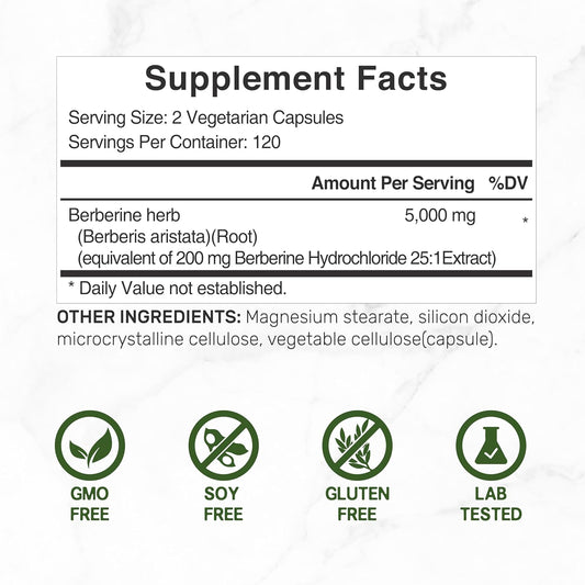 Berberine Max Supplement with Turmeric - 5,000mg Per Serving - 240 Veggie Capsules - 97% Pure Berberine HCL - Non-GMO - Vegetarian Friendly