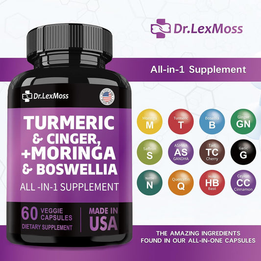 Joint Support Supplement with Turmeric, Ginger, Moringa, Boswellia, Saffron, Ceylon Cinnamon, Quercetin, and Tart Cherry - 60 Capsules from Dr. LexMoss - 30000mg Turmeric, 3000mg Ginger, 50000mg Moringa, 3000mg Boswellia, 2000mg Saffron