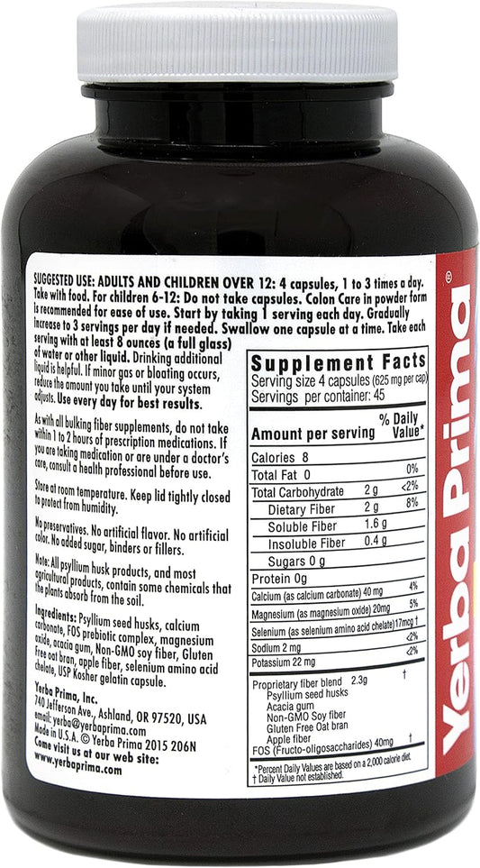 180 Count Yerba Prima Prebiotic Colon Care Capsules - Pack of 2, Gluten Free, Made in USA, Non-GMO, Soluble & Insoluble Fiber, Promotes Colon Health