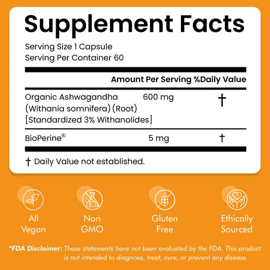 60 Count Organic Ashwagandha Capsules with BioPerine for Stress & Mood Support - Vegan - 2-Month Supply - Alevit Nutrition