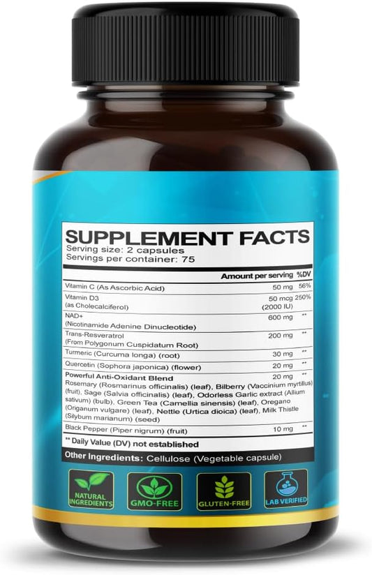 15-in-1 NAD+ Boosting Complex Supplement for Women & Men - Resveratrol, Turmeric, Quercetin, Rosemary, Bilberry, Sage, Green Tea - VEGATOT