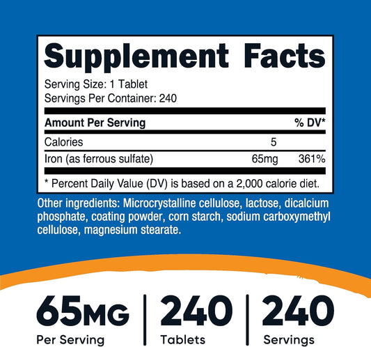240 Tablets of Nutricost Iron (Ferrous Sulfate) 65mg - Non-GMO & Gluten Free