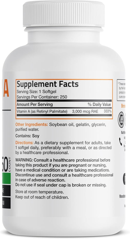 Bronson Vitamin A 10,000 IU Softgels for Healthy Vision, Immune System, Growth & Reproduction - 250 Count