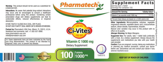 Pharmatech® Ci-Vites 1000mg Vitamin C Supplements for Immune Support - High Potency Antioxidant Tablets, USA Made, Sugar Free - 100 Count