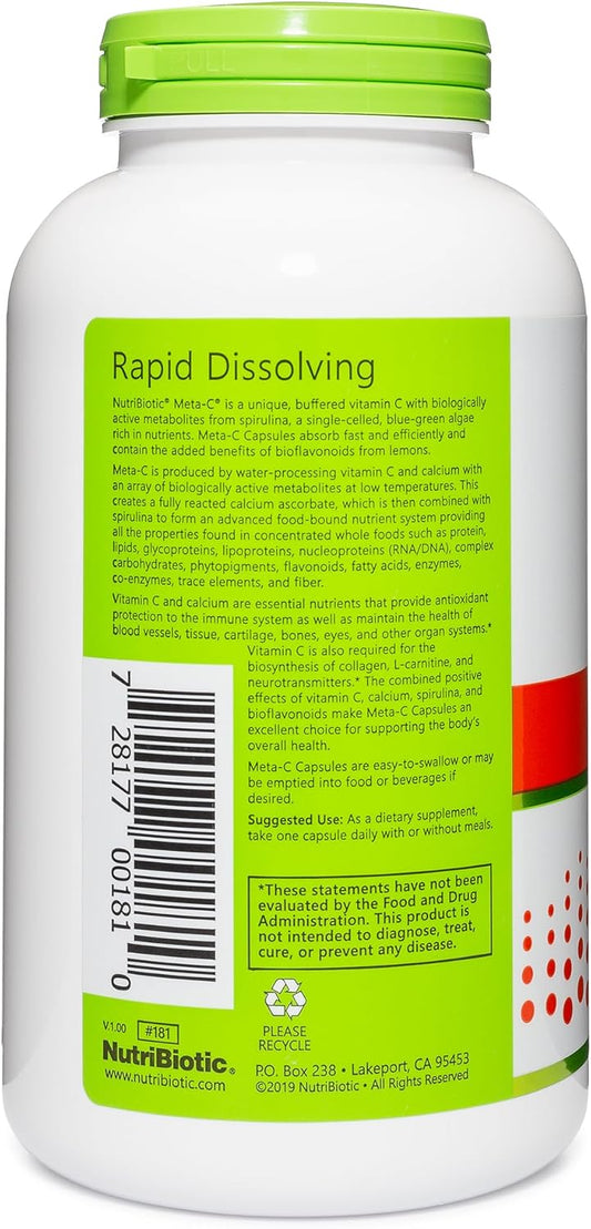 NutriBiotic Meta-C Capsules 500mg: Spirulina-Bound Vitamin C with Calcium & Lemon Bioflavonoids, 250 Count