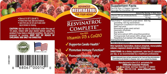 60 Count Resvinatrol Complete Capsules - Resveratrol Supplement for Healthy Aging, Heart Health, Immune Function - Quercetin, Grape Seed Extract, Vitamin D3, CoQ10