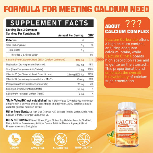 1000 mg Calcium Citrate Gummies with Vitamin D3, K2, Magnesium & Strontium - Supports Bone Health & Immune System for Adults